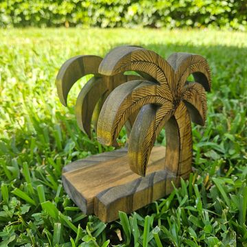 This item measures approximately 6 inches tall and 6 inches wide with 2.25 inches in between palm trees.